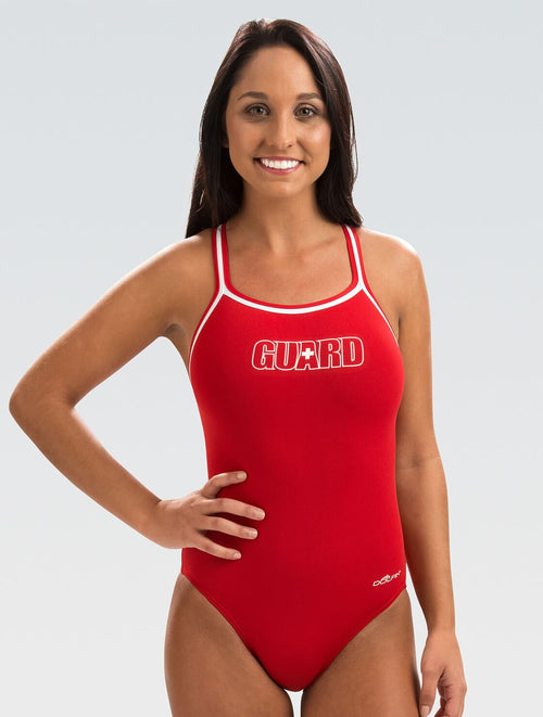 Wherever duty calls, our DBX-back guard swimsuit in solid red will have you covered with UVA and UVB 50+ protection, Durastitch for hundreds of durable hours, and long-lasting straps.