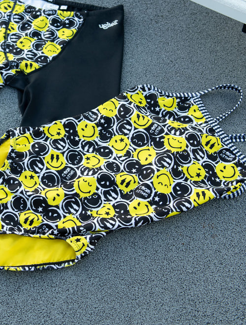 Swim strong and smile on with the Uglies | SmileyWorld® Smile On V-Back One Piece, where bold design meets unbeatable performance. This limited-edition collab between Uglies and SmileyWorld® brings a monochrome-meets-bright pop aesthetic, featuring an all-over black-and-white Smiley print with vibrant yellow accents for a fresh, eye-catching look. Whether you’re diving into training or just making waves, this suit is a celebration of positivity and performance. Be happy. Be you. Be original.