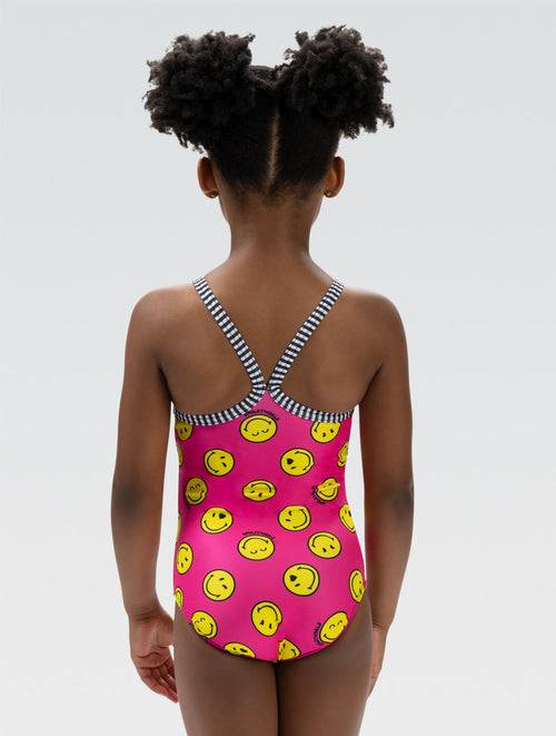 Smiles, sunshine, and splashes—what more could she need? The Little Dolfin Girls' | SmileyWorld® All Smiles One Piece Swimsuit brings all the happy vibes to the pool with its bright pink background and cheerful SmileyWorld® print. Designed for little swimmers who love to move, this fun and playful swimsuit features signature Uglies striped straps for a secure and stylish fit. This swimsuit is all about celebrating originality and self-expression, encouraging every little swimmer to shine bright and be themselves. Because every splash, every giggle, every little swimmer is original. Whether she’s learning to swim or just having fun in the sun, this smile-filled swimsuit is perfect for every little splash she makes!
